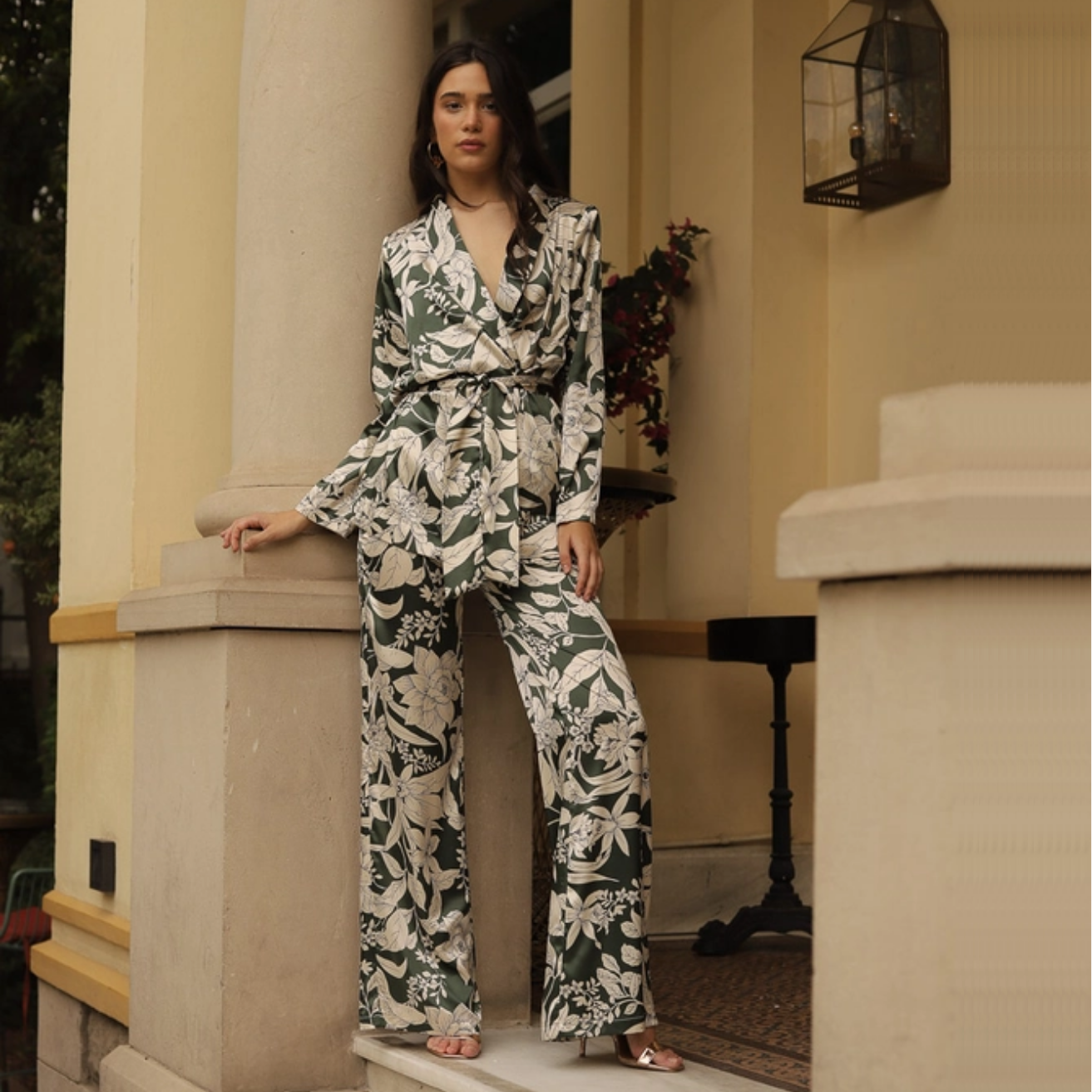 Suit in printed satin fabric. Blouse jacket with lapels and tie to adjust. Inner shoulder pads. Straight pants with high waist and invisible side zipper.
